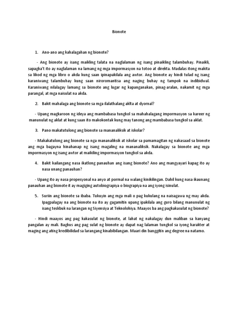 Ano ang Bionote Ang bionote ay isang maiksing tala ng personal na impormasyon ukol sa isang magtatanghal o sinumang. Sa iilang salita na hindi kasing haba ng autobiography ang. 12crosswise answer directly 1Bakit mahalaga ang bionote sa mga ilalathalang aklat at dyornal.