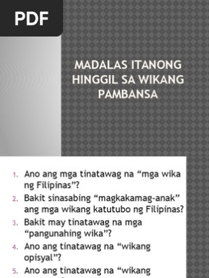 1Nagtipon ang mahigit 200 na mga guro manunulat mananaliksik at mga mag-aaral mula sa ibat ibang pamantasan para sa talakayang Bantay Wikang Filipino. BAKIT MAY PATULOY NA TUMUTUTOL SA PAGPAPATUPAD NG PATAKARANG MAKAWIKANG FILIPINO. Download Full PDF Package.